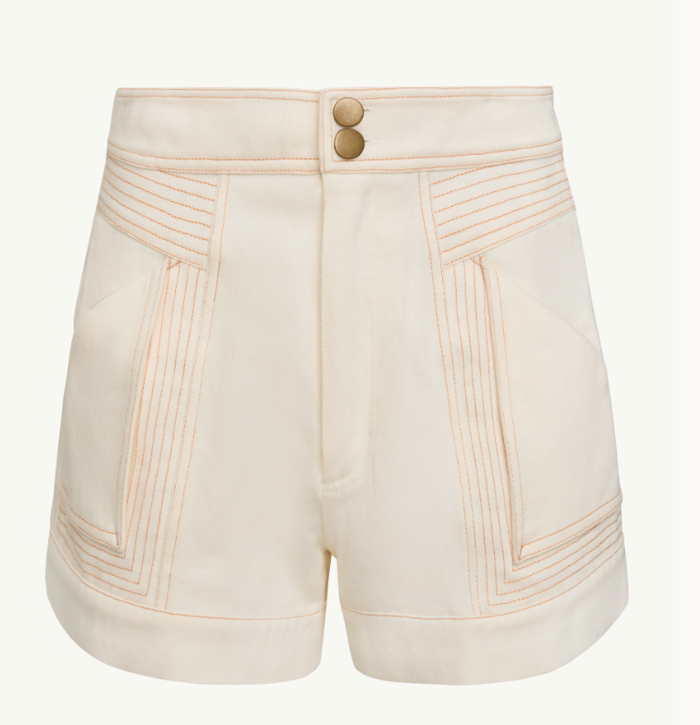 The Essie Short in cream is a polished warm-weather staple with a clean, structured feel. Designed with a high-waisted silhouette, it features a double-button front closure and crisp seam detailing that adds subtle dimension. Oversized front patch pockets lend a modern, utility-inspired touch while keeping the look refined.