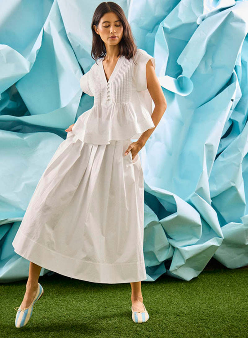 The Lola Top brings a feminine touch to everyday ease. Designed in our bold petrol green, it features a flattering V-neckline, delicate pintuck detailing, and short banded sleeves that add just the right amount of structure. 100% Cotton