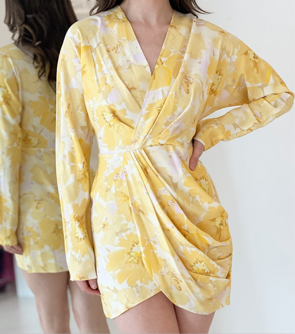 The Maeve Mini Dress in Gold Poppy Floral is a relaxed silhouette. V-neckline, full length sleeves, gathered fabrication from the waist and asymmetrical hemline. The perfect piece to take away with you on holiday ~ pair with a simple slide for a complete look.
