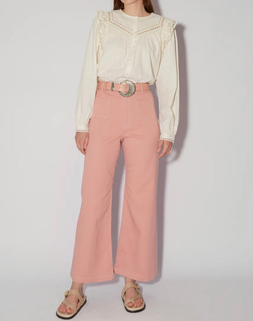Featuring French embroidery, the Mersej Shirt is made from a linen cotton blend that can be styled together with the matching Mersej Skirt or worn separately. The shirt features signature ruffle details as well as embroidered cuffs and front buttons which can be left open or worn closed.
