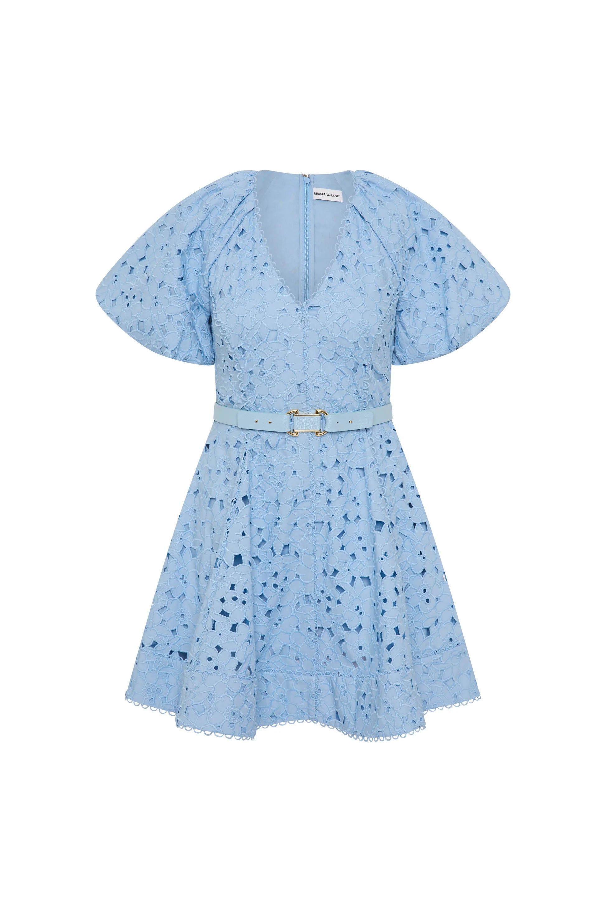 The Wilda Mini Dress stuns in a soft blue hue, tailored from broderie anglaise. Highlighting raglan short puff sleeves, the V-neckline effortlessly harmonises with the fitted bodice, refined with princess seams and scalloped trim details. Cinched at the waist by a PU belt, the circular mini skirt creates a chic silhouette. Complete with lining and an invisible zip fastening at the back, this versatile dress is a lovely choice for your next garden party.